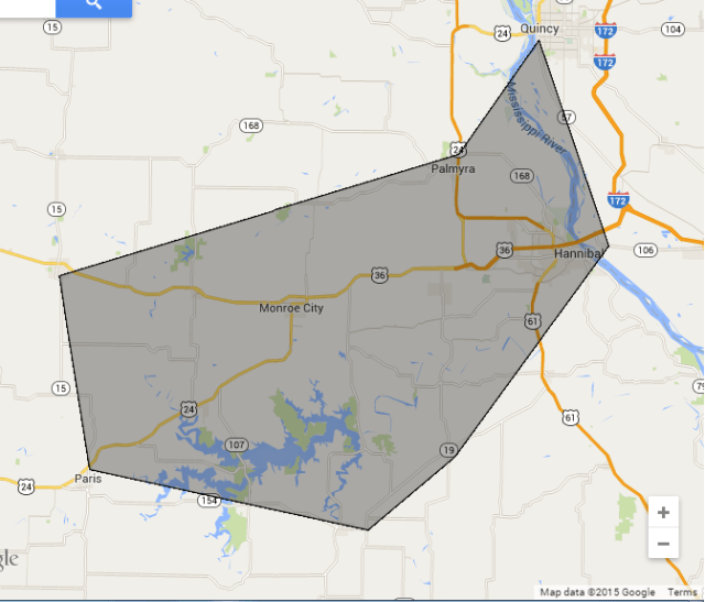 Until further notice, I have established a delivery zone, outlined in the photo. The area comprises Paris, 154 & 19 Junction, Center, Hannibal, Quincy, Palmyra, and Shelbina. For orders of $160 or more, delivery is free within this zone. Locations to the northwest of the outline will be included, as long as they fit within the approximate radius of Monroe City.