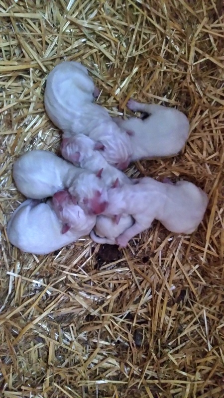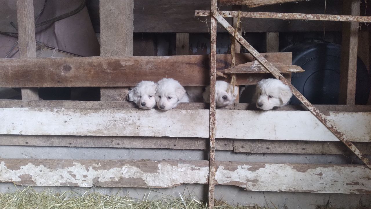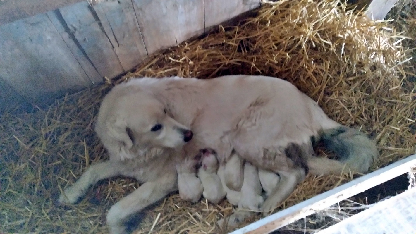 Maremma. Three of the litter of six are sold/reserved. They are approaching 15 lbs and spend their days wrestling and learning to bark. They are very relaxed–on their journey to the veterinary clinic, they laid on Kristin as if she were one of them. Their mother is guarding the barn and staying very close.